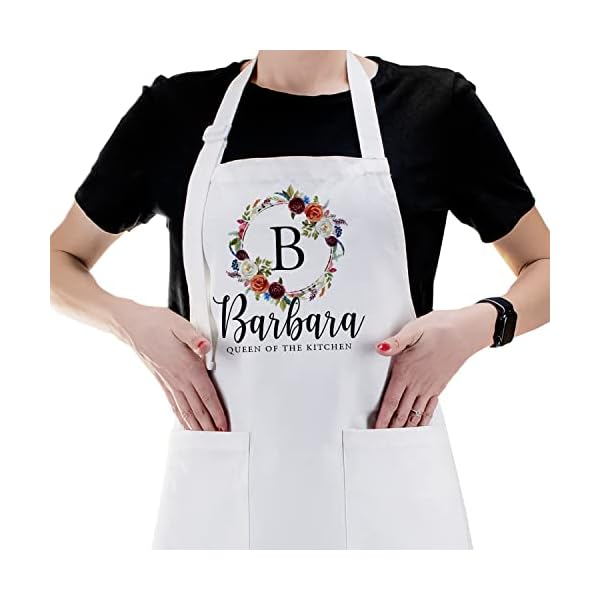 Personalized Kitchen Aprons Floral Initial Design w/Name Text – Customized Women Cooking Apron w/Pockets Custom Chef White Gifts for Baking Bbq Grill Funny Mujer Cocina Delantal C1, Standard
